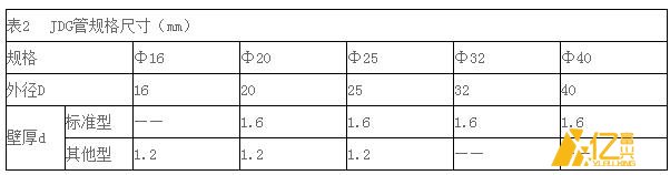 套接緊定式鍍鋅鋼導管,簡稱JDG管。導管采用優質冷軋帶鋼,經高頻焊機組自動焊縫成型、雙面鍍鋅保護;壁厚均勻,卷焊圓度高,與管接頭公差配合好,焊縫小而圓順,管口邊緣平滑;用配套彎管器彎管時橫截面變形小。導管出廠長度為4m,共有Φ16、Φ20、Φ25、Φ32、Φ40五種規格。標準型導管壁厚為1.6mm,預埋、吊頂敷設均適用;其他型導管壁厚為1.2mm,僅適用于吊頂敷設。見表2。